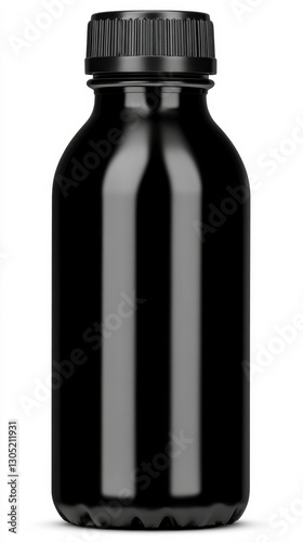 Black plastic bottle with a screw cap, isolated on white background. Simple, sleek design. Suitable for various product packaging.
