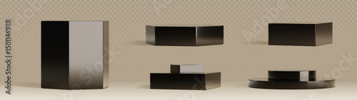 Black podiums set on transparent background. Pedestals in various shapes - rectangular block, angled hexagon structure, curved cylinder form. 3d realistic blank glossy plinths for product exhibition.