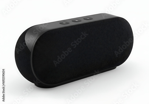Black portable speaker resting on white surface, showcasing its sleek and modern design, perfect for music enjoyment at home or on the go.