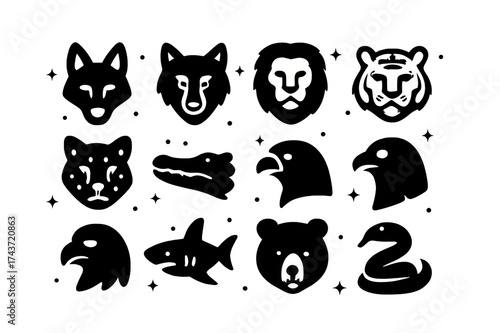 Black Predator Icons. Predators. Solid icons set of Predators: jackal, wolf, lion, tiger, leopard, hyena, crocodile, eagle, hawk, shark, bear, snake. Filled