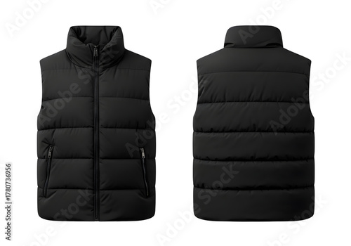 Black puffer vest front and back view isolated on transparent background