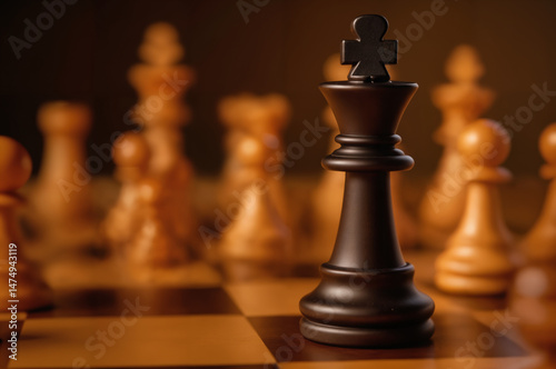 Black Queen Chess Piece – Elegant Strategy Symbol on Wooden Board with Blurred Pawns for Chess Close Up Photography and International Chess Day Promotions