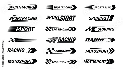 Black racing sticker set with fast car decals, sport automobile labels, vehicle wraps, and speed-themed vector badges. Isolated motorsport graphics on a white background.