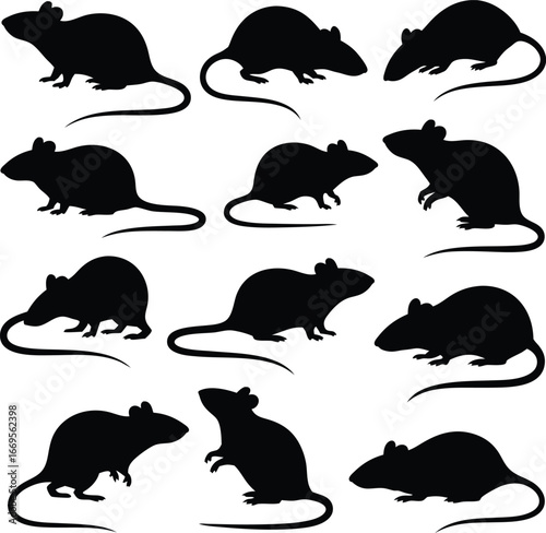 Black Rat Silhouette Multiple Poses of Rodents with Tails on White Background