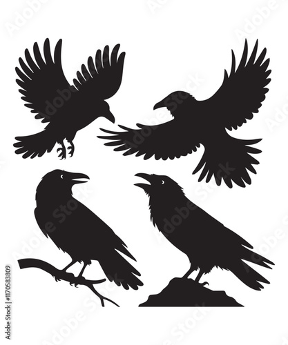 Black Raven Silhouettes Mysterious and Gothic Designs on a White Background