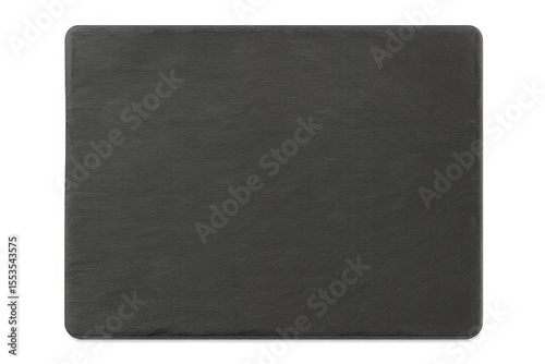 Black rectangular slate board lying on transparent background, ready for displaying restaurant menu or informational content