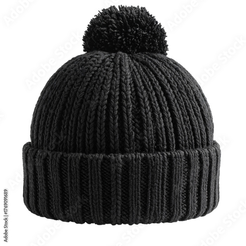 Black ribbed beanie mockup isolated on transparent background, perfect for winter apparel branding, customization, or showcasing cozy knitwear product designs.
