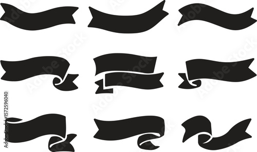 Black Ribbon Banner Vector Set for Headers & Labels-Curved Hand-Drawn Style