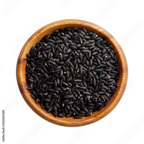 Black Rice in Wooden Bowl Isolated on White Background. PNG transparent.