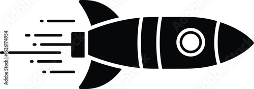 Black rocket icon, vector silhouette of fast spaceship, launch symbol, science exploration graphic, isolated design for space or startup concept