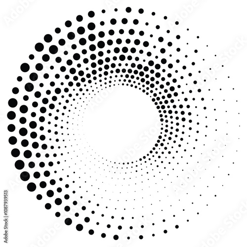 Black round halftone texture. Dotted radial swirl or tornado shape. Gradient circle. Pop art retro style.