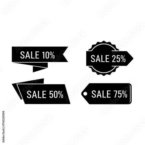 Black sale banners display different percentage discounts for promotional marketing campaigns, offering savings and deals to customers.