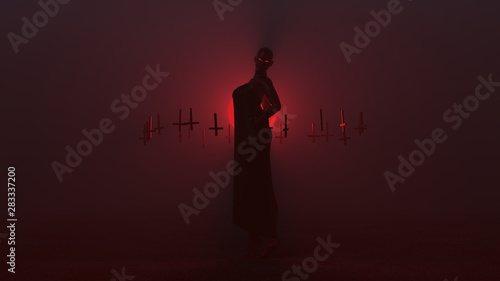 Black Seductive Vampire Devil in a Long Futuristic Haute Couture Dress with her Hands on her Hips Back Arched and Upside Down Floating Crosses Abstract Demon in a Foggy Void 3d illustration