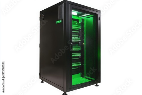 Black Server Network Rack Cabinet with Bright Green Internal Light Isolated on White Background