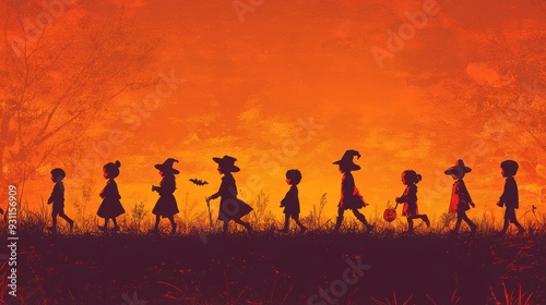 Black shadow of Children dressed in Halloween fancy dress on hallloween background,go Trick or Treating Halloween night,Jack O Lantern,october banner,horror spooky season,Illustration for holiday.