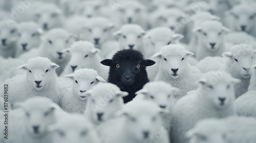 Black Sheep Standing Out in a Crowd of White Sheep, Symbolizing Individuality and Uniqueness