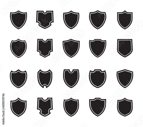 Black shield icons in different shapes isolated on a white background. Protect shield security icon sets.