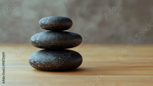 black shiny zen stones balanced on each other for meditation and balance, with copy space for text