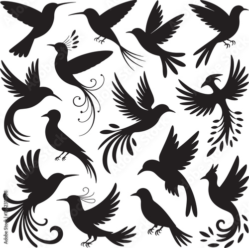 Black Silhouette Birds Collection Flying Hummingbirds Exotic Birds Decorative Elements Graphic Design