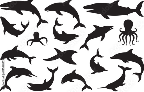 Black silhouette collection of marine animals dolphins and sharks