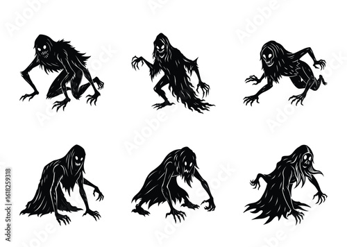 Black Silhouette Creepy Creatures on White Background Vector Set Illustration