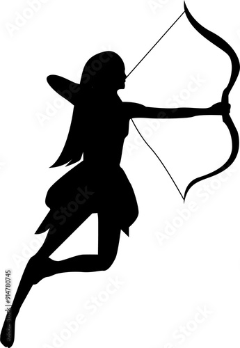 Black silhouette illustration of a beautiful elegant woman holding bow and taking aim at something Isolated on white