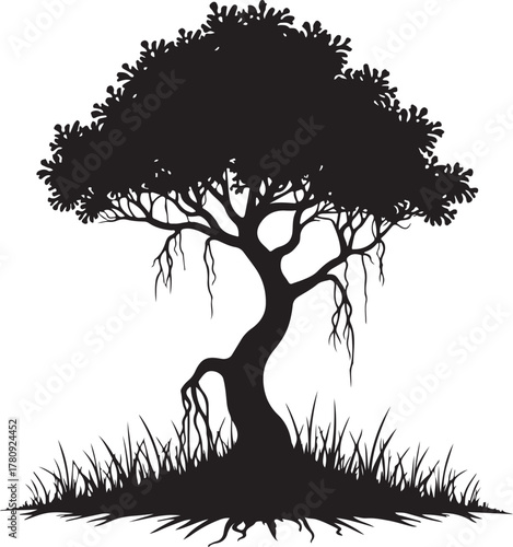 Black silhouette of a banyan tree with hanging roots and grass