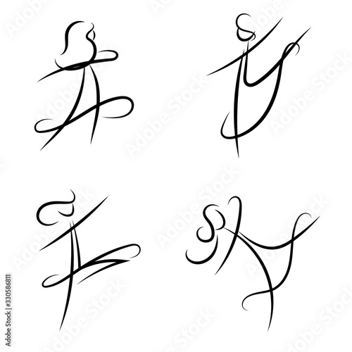 black silhouette of a dancing girl in a dress drawn in the form of lines isolated on white background