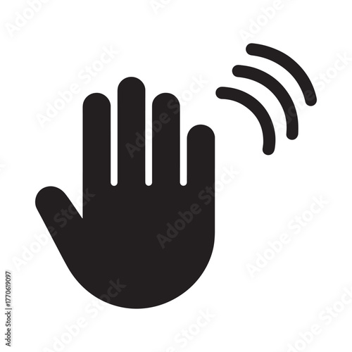 Black silhouette of a hand waving with motion lines indicating a greeting or signal