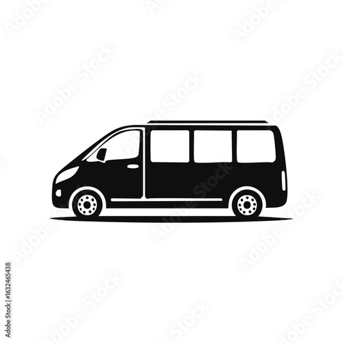 Black silhouette of a minivan with multiple windows and roof rails, side view