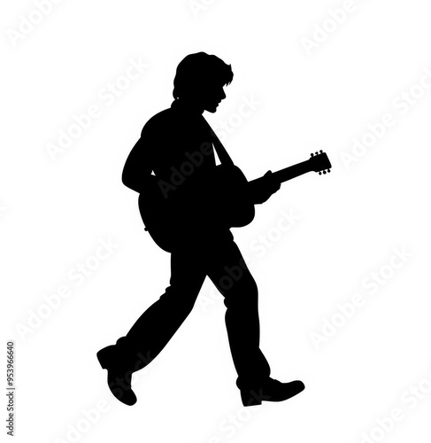 Black Silhouette of a musician playing a guitar on a white background.