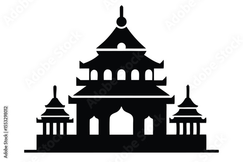 Black Silhouette of a Traditional Asian Building with Pagodas, Arches, and Tiered Roof