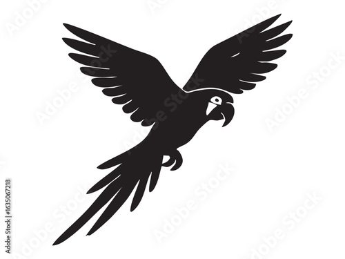 Black silhouette of macaw parrot flying with outstretched wings, isolated on white background. concept of bird, freedom, tropical wildlife, exotic pet, decorative art, icon