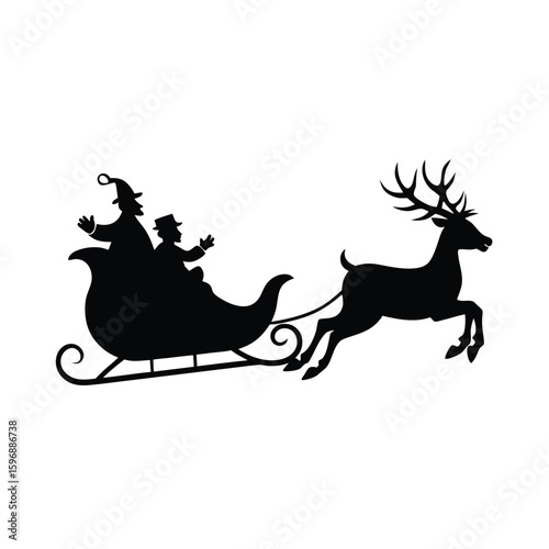 Black silhouette of santa claus flying in his sleigh with reindeer