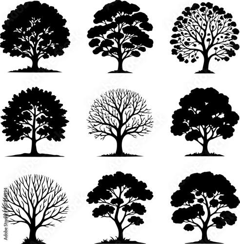 black silhouette trees, each with unique branching patterns and foliage density