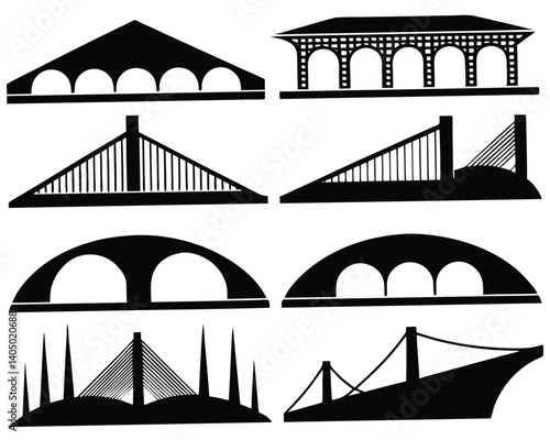 Black Silhouette Vector Art of Bridge Architecture: Modern Arch, Suspension, and Cable-Stayed Designs for Engineering and Construction