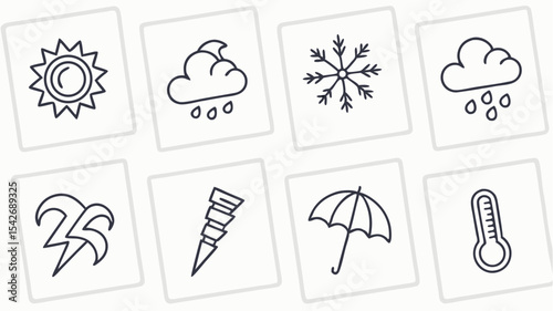 Black silhouette weather icons showing sun, rain, snow, storm, tornado, umbrella and thermometer in a simple line art style