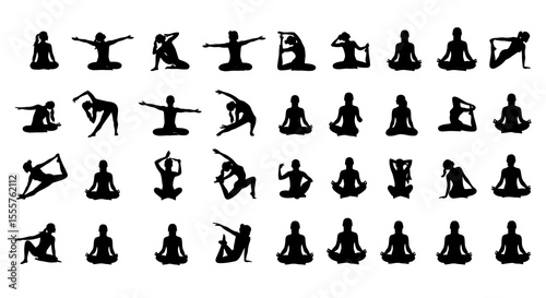 Black Silhouette Yoga Poses Demonstrating Various Stretching Exercises