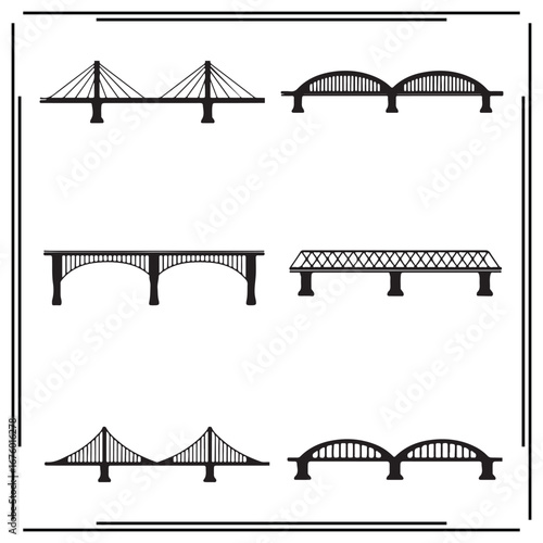 Black Silhouettes of Different Bridge Designs - Suspension, Arch, and Truss Bridges, Structural Engineering Icons, Urban Infrastructure Symbols, River Crossing Bridges