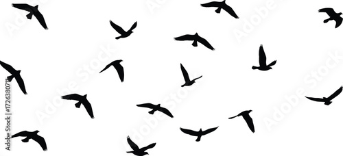 Black silhouettes of flying birds flocking in the clear white sky, representing freedom, migration, and unity, isolated graphic design element background