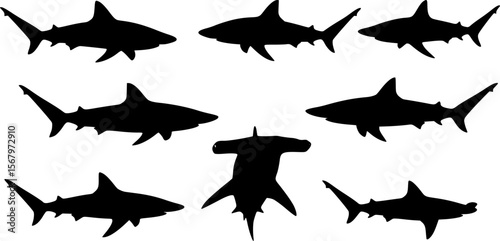 black silhouettes of various sharks, hammerhead shark, sharks swimming, aquatic life, marine animals