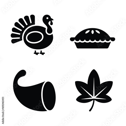 Black silhouettes thanksgiving icons turkey pie cornucopia maple leaf simple graphic elements silhouette vector illustration white background