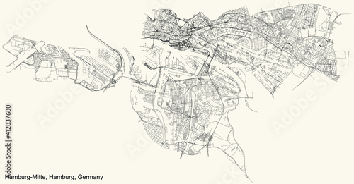 Black simple detailed street roads map on vintage beige background of the neighbourhood Hamburg-Mitte borough (bezirk) of the Free and Hanseatic City of Hamburg, Germany