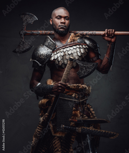 Black skinned antique soldier with dual axes looking at camera