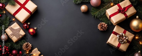 Black sleek holiday layout, glowing Christmas elements with sharp minimalist design, modern festive atmosphere