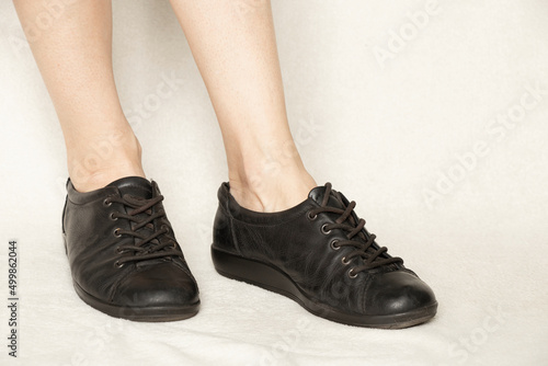 Black sneakers on the feet of a girl on a white carpet, shoes