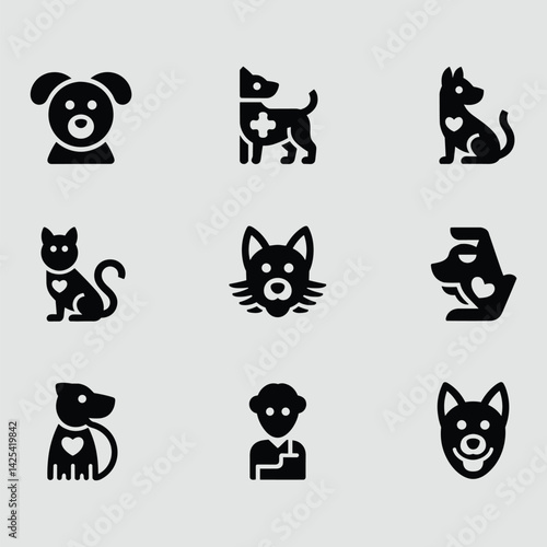 Black Solid Icon Set Depicting Various Cats Dogs And A Veterinarian Against A Gray Background