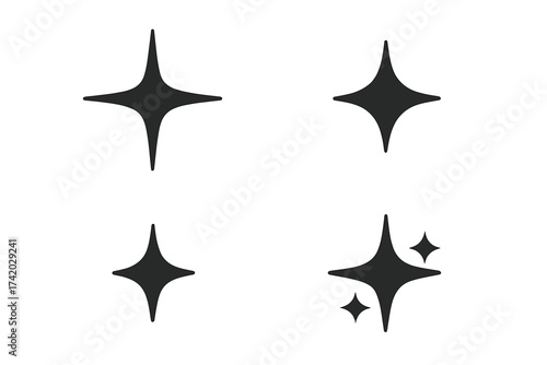 Black sparkle icons set, shining star elements collection, bright glitter vector illustration for decoration, clean light effect digital symbols, magic twinkle graphic, transparent background design