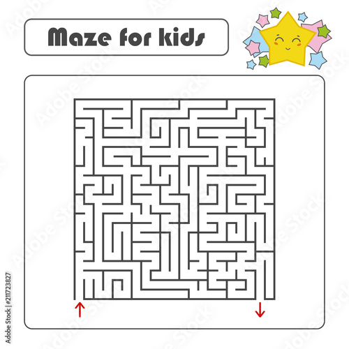 Black square maze with entrance and exit. With a lovely cartoon star. Simple flat vector illustration isolated on white background.
