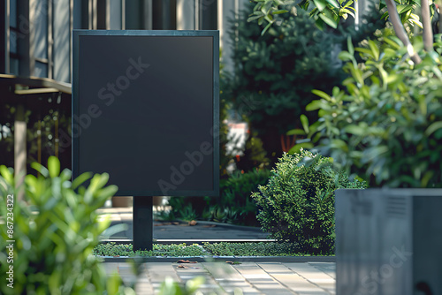 Black square signboard mockup in outside for logo design, generative ai image.